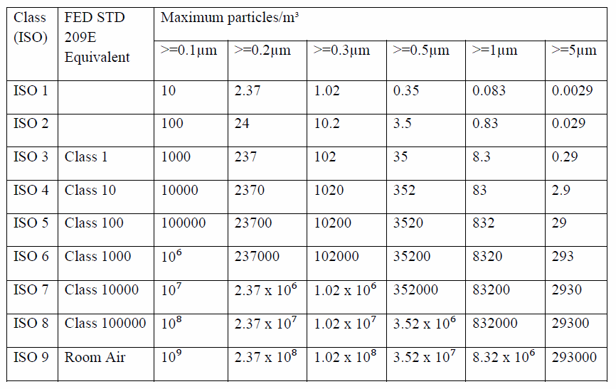 國際標(biāo)準(zhǔn)組織建立了九個潔凈室分類。這些標(biāo)準(zhǔn)被分配了從 ISO 1 到 ISO 9的分類。潔凈室分類基于房間的清潔度。這些分類被分解為每立方米有多少特定尺寸的顆粒,然后被分配一個 ISO 分類。然后根據(jù) ISO 標(biāo)準(zhǔn)分配類。不同的行業(yè)需要不同的清潔度和無菌度。