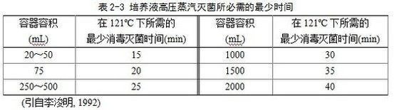 使用高壓蒸汽滅菌器滅菌時,將分裝好的培養(yǎng)液放入底部有一定量(淹沒加熱管)涼水的高壓蒸汽滅菌器內(nèi),增壓**0.35~0.4 kg/cm2時排凈滅菌器內(nèi)冷空氣,以便使蒸汽能到達(dá)各個消毒部位,保證消毒滅菌徹底。然后繼續(xù)加壓加熱,當(dāng)壓力表讀數(shù)達(dá)到1.0~1.1 kg/cm2為121 ºC,保持15~20 min即可。由于消毒滅菌效果取決于溫度而不是壓力,所以在一定壓力下保持較長的消毒滅菌時間是必須的。在121 ºC的蒸汽溫度下可以很快殺死各種細(xì)菌及高度耐熱的芽孢桿菌,因此許多培養(yǎng)液的消毒滅菌壓力、溫度一般保持在1.0~1.1 kg/cm2、121 ºC。消毒滅菌時間與需要消毒滅菌的培養(yǎng)液量密切相關(guān)(表2-3),時間不足達(dá)不到滅菌效果,時間過長培養(yǎng)液內(nèi)的一些化學(xué)物質(zhì)遭到破壞,影響培養(yǎng)液成分。消毒滅菌結(jié)束后,關(guān)閉熱源,只有當(dāng)滅菌器內(nèi)壓力降為零時才能打開放氣閥,排除剩余蒸汽,取出培養(yǎng)液。不可在壓力較高時打開放氣閥,引起減壓沸騰,使容器中液體溢出。培養(yǎng)液組成中如含有遇熱易分解的物質(zhì),則需用過濾方法消毒滅菌。shou先對培養(yǎng)液中耐熱組分進(jìn)行高壓蒸汽滅菌后放置在無菌場所,固體培養(yǎng)液在40 ºC左右瓊脂即將凝結(jié)前,加入經(jīng)過過濾除菌的不耐熱溶液,混勻后冷卻備用。液體培養(yǎng)液在冷卻到室溫后再加入過濾除菌溶液。過濾除菌時,使用孔徑為0.22~0.45 μm或更小的細(xì)菌濾膜。過濾除菌可利用抽濾裝置或注射過濾器進(jìn)行,所用器皿均應(yīng)進(jìn)行高壓消毒滅菌,溫度不應(yīng)超過121 ºC。