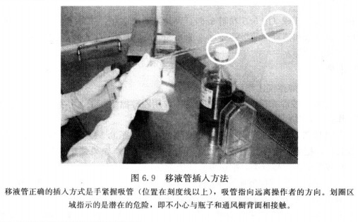 (a)如果是玻璃吸管,從盒中取出吸管時.要保持待取吸管在盒中與其他吸管平行,并盡叮能少地接觸他們,特別是吸管頭部,如果拿著的吸管接觸了其他仍在盒內(nèi)的吸管尾端.則不能再使用它;把吸管插人移液器中,吸竹指向你的外側(cè),握在刻度上面部分,這樣,吸管進人試劑瓶或培養(yǎng)瓶的部分將不會被污染(圖6.9).