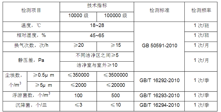 1.1 為了保證潔凈度滿足工藝需求,必須對潔凈室內潔凈度進行檢測。 1.2 生產管理員負責每班次上下午監控記錄潔凈室溫濕度和靜壓差,并記錄。 1.3 檢測周期:檢測頻率見下表: