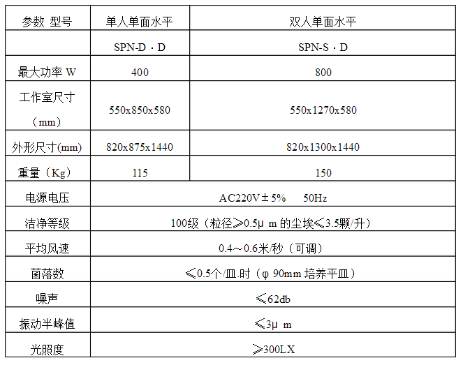 凈化工作臺(tái)(以下簡(jiǎn)稱(chēng)工作臺(tái))是一種提供局部無(wú)塵、無(wú)菌工作環(huán)境的空氣凈化設(shè)備,對(duì)改善工藝條件和保證產(chǎn)品的高精度、高純度、高可靠性具有良好的效果。因此,廣泛應(yīng)用于醫(yī)療衛(wèi)生、制藥、生物、電子、G防、精密儀器儀表、化學(xué)實(shí)驗(yàn)等行業(yè)。 二、 主要技術(shù)參數(shù)