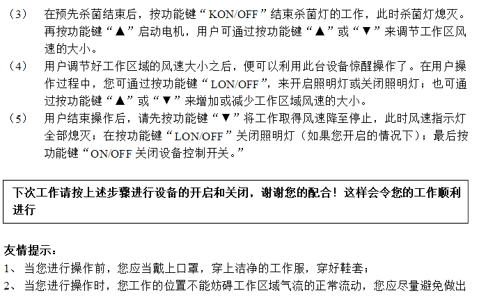 設(shè)備開始進(jìn)入工作狀態(tài)。此時(shí)風(fēng)速轉(zhuǎn)速指示燈亮起兩格(此為初次開機(jī)或拔插電源后的初次預(yù)設(shè)的工作區(qū)風(fēng)速,為初次默認(rèn)值),此時(shí)送風(fēng)電機(jī)已經(jīng)按照預(yù)置設(shè)定開始工作,用戶此時(shí)按功能鍵“▼”來減少工作區(qū)得風(fēng)速直**風(fēng)速指示燈全部熄滅;